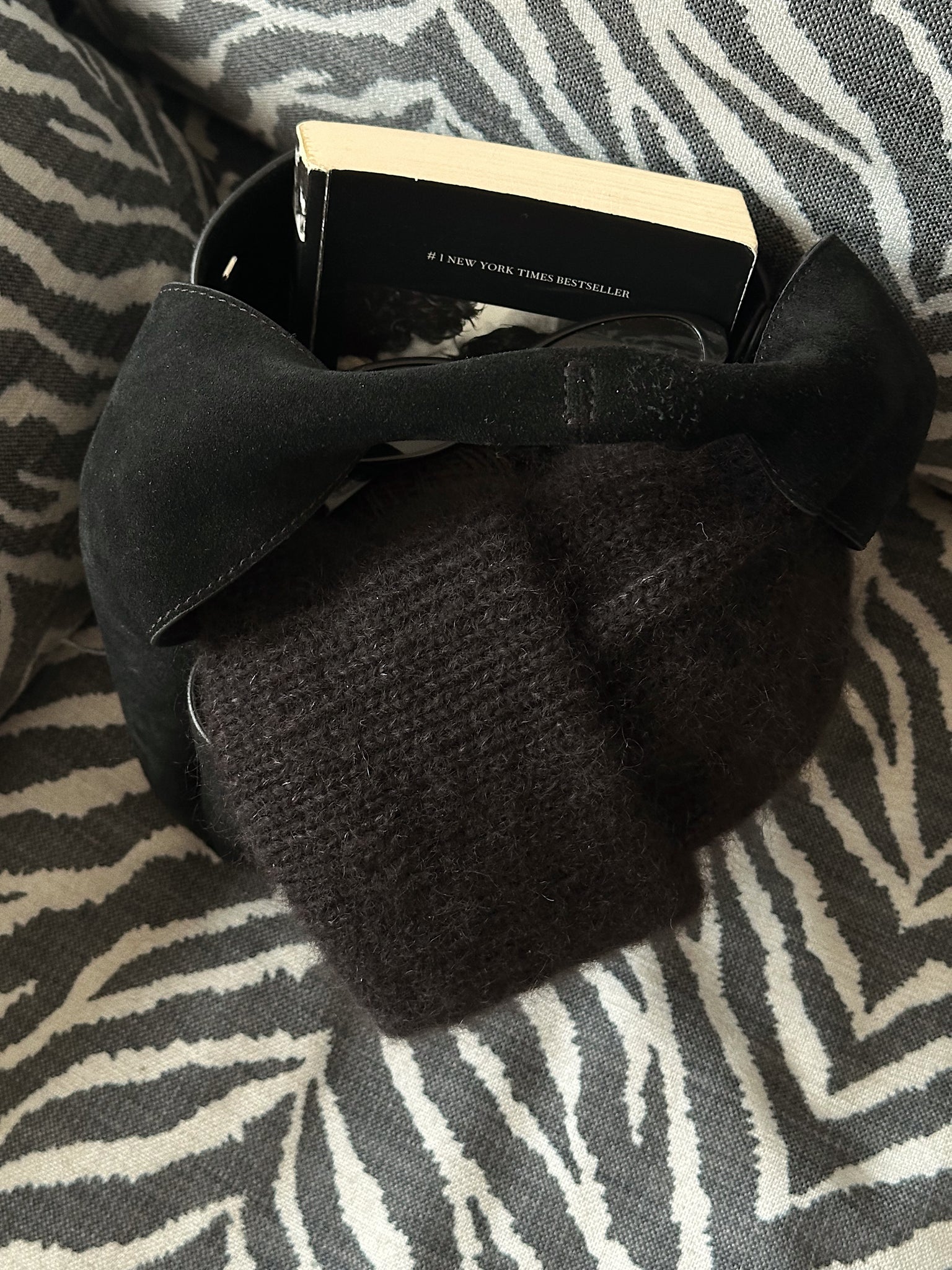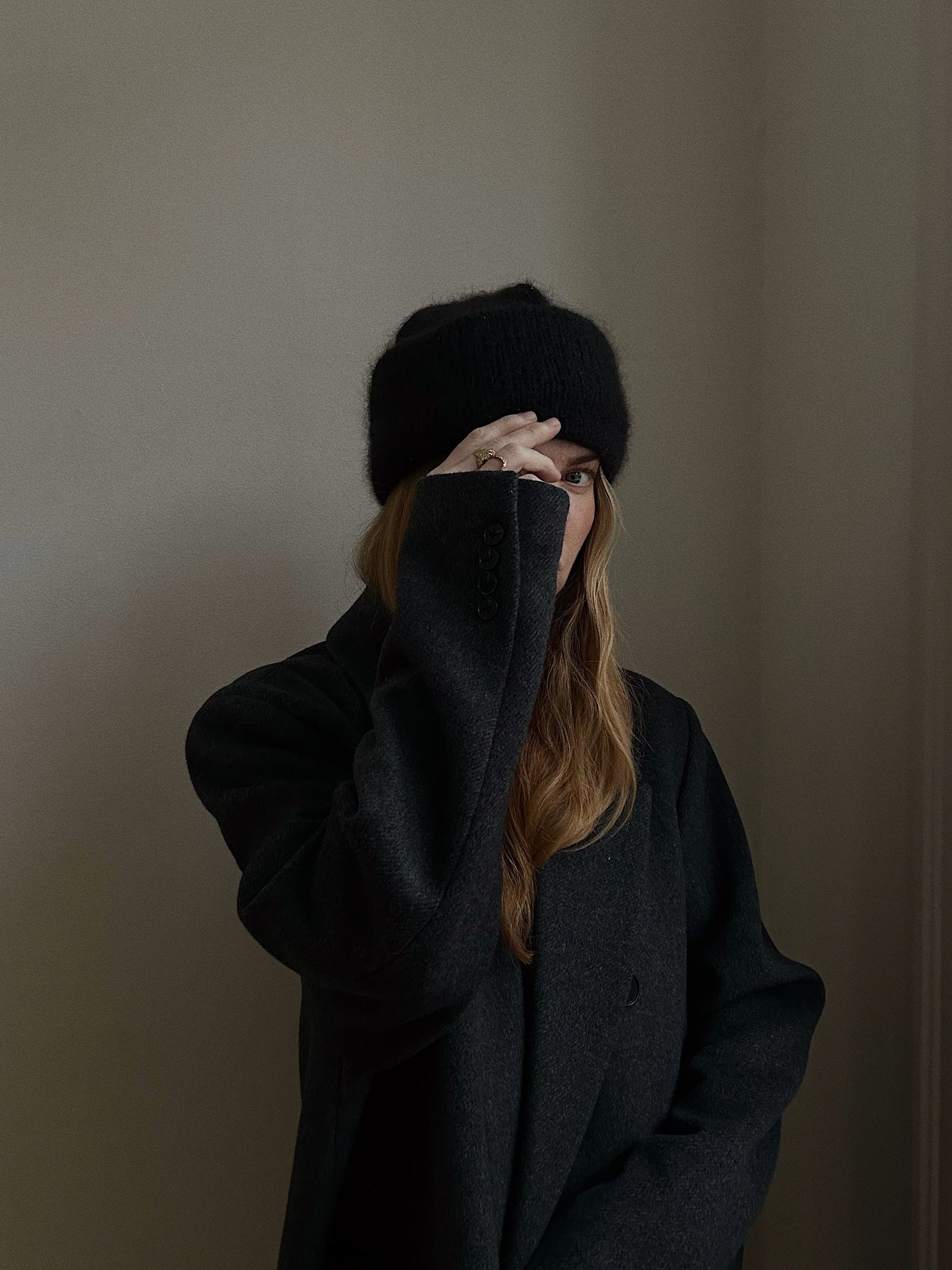 Den sorte udgave er strikket i to tråde Soft Silk Mohair, Knitting for Olive og en tråd Merino. Alle tre tråde i farven 'Lakrids'.