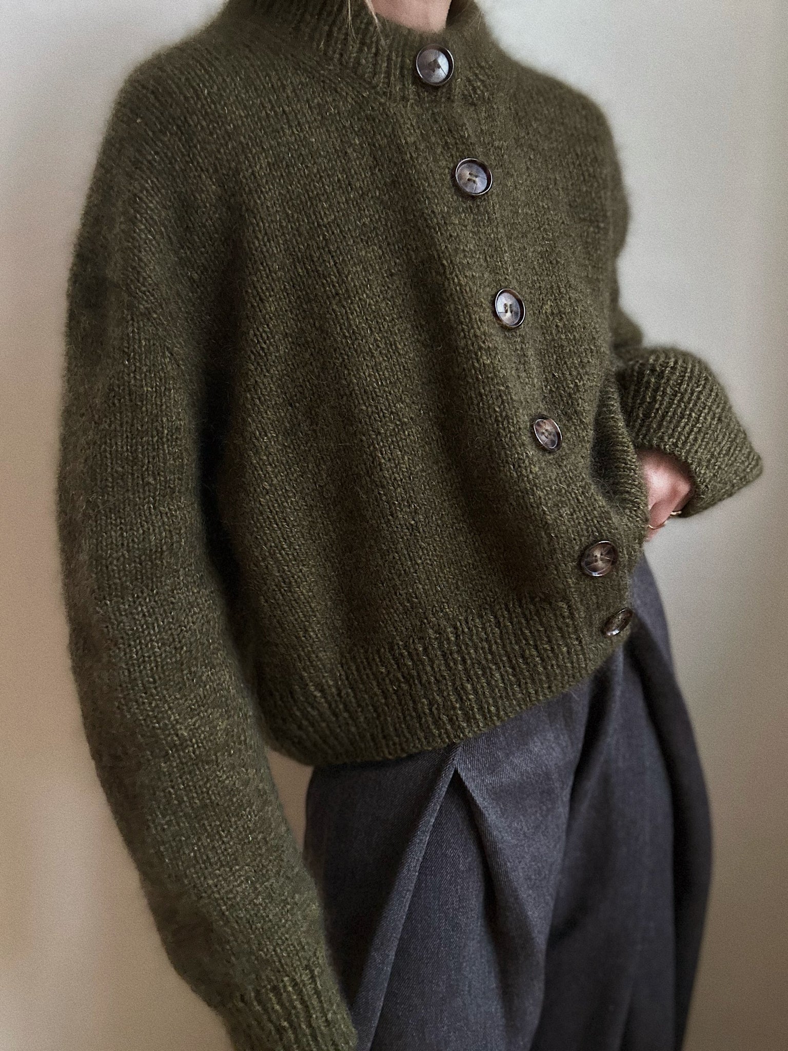 Dobbeltstrikkede knappestolper og en dobbeltbrettet halskant gir cardiganen et luksuriøst uttrykk, mens få, men viktige detaljer skaper blikkfang og sikrer samtidig en god passform.