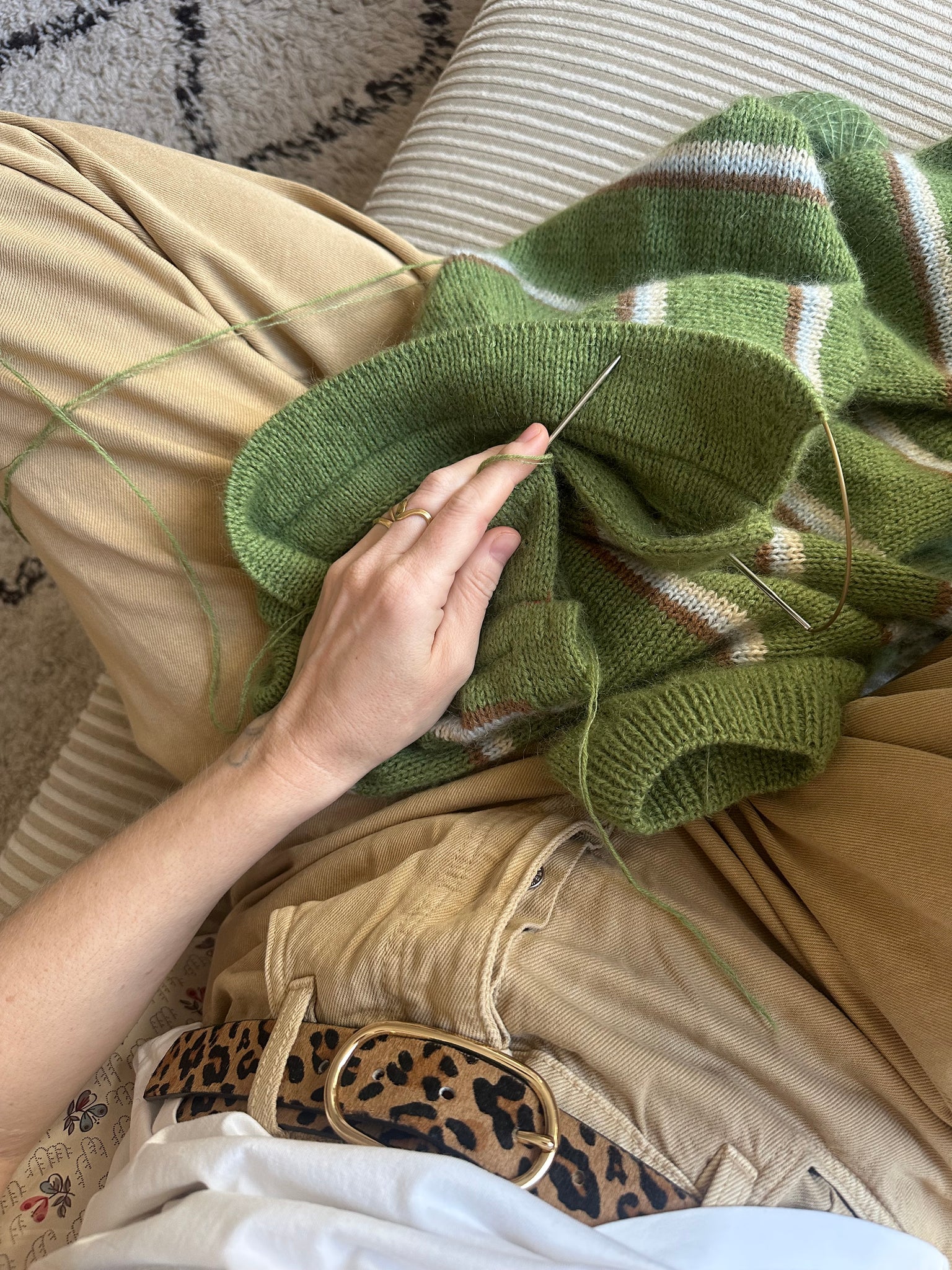 Eksempel: Du måler 89 cm om brystet + 10-12 cm = 99-101 cm. Altså bør du strikke en str. S med en overvidde på 101 cm.